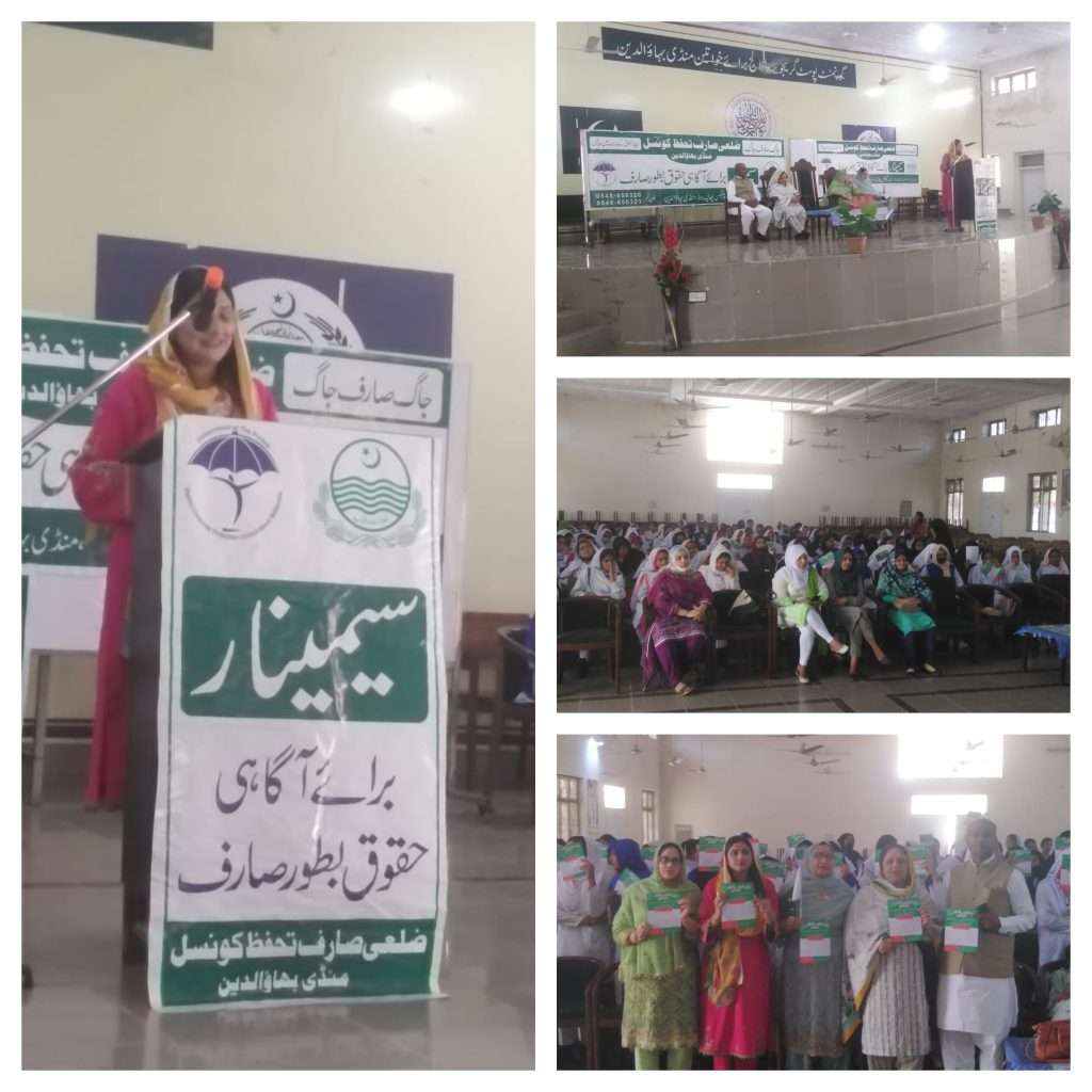منڈی بہاؤالدین(ڈاکٹر شاہد راٹھور) اسسٹنٹ ڈائریکٹر لیگل، ڈسٹرکٹ کنزیومر پروٹیکشن کونسل منڈی بہاؤالدین شہلا مبین کی زیر صدارت گورنمنٹ پوسٹ گریجویٹ کالج برائے خواتین منڈی بہاوالدین میں صارفین کے حقوق کی آگاہی مہم کے سلسلہ میں سیمینار منعقد ہوا۔ سیمینار میں اساتذہ، خواتین ممبران اور طالبات کی کثیر تعداد نے شرکت کی۔ سیمینار میں اسسٹنٹ ڈائریکٹر (لیگل) ڈسٹرکٹ کنزیومر پروٹیکشن کونسل شہلا مبین نے پنجاب کنزیومر پروٹیکشن ایکٹ 2005 اور 2009 پر تفصیلی روشنی ڈالی۔ ان کا کہنا تھا کہ عام عوام کے حقوق کے سلسلے میں ڈسٹرکٹ کنزیومر پروٹیکشن کونسل منڈی بہاوالدین کا قیام خوش آئند ہے۔ ہمیں اس فورم کا بطور صارف یا خریدار بھرپور فائدہ اٹھانا چاہیئے۔ اسسٹنٹ ڈائریکٹر کا کہنا تھا کہ صارف اپنے حقوق کے تحفظ کیلئے خریدی گئی اشیاء کی رسید لازمی حاصل کریں، ناقص اور زائد المیعاد اشیاء فروخت کرنے والوں اور ناقص خدمات کی فراہمی پر پنجاب صارف تحفظ ایکٹ 2005 اور 2009 کے تحت اپنی شکایات کے ازالہ کیلئے ضلعی کنزیومر پروٹیکشن کونسل اور کنزیومر کورٹ سے رجوع کریں تا کہ ان کی مکمل داد رسی کی جا سکے۔ سیمینار سے ممبران کنزیومر پروٹیکشن کونسل نے بھی خطاب کیا۔