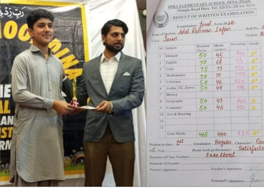 دینہ کے معروف صحافی عرفان احمد مرزا کے صاحبزادہ عبدالرحمن نے سالانہ امتحان میں 7کلاس میں 460نمبر وں میں سے 440نمبر لے کر پہلی پوزیشن حاصل کر لی