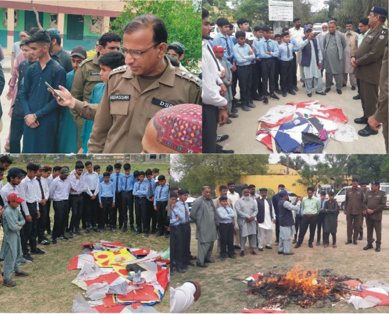 ڈنگہ+سرائے عالمگیر(زمان اسلم+ڈاکٹر تصور حسین مرزا)ڈی پی او گجرات سید اسد مظفر کی پتنگ بازی کے خلاف، پتنگ جلاؤ انسانی جان بچاؤ مہم کا آغاز،اساتذہ اور بچوں کی کثیر تعداد نے پتنگ اور ڈور کو آگ لگائی.تفصیلات کے مطابق وزیر اعلیٰ پنجاب مریم نوازکی ہدایت اور آئی جی پنجاب کے احکامات کے مطابق ڈی پی او گجرات سید اسد مظفر کی قیادت میں گجرات پولیس کی پتنگ بازی کے خلاف مہم جاری۔ ڈی ایس پی لالہ موسیٰ سرکل ڈی ایس پی سرائے عالمگیر مدثر اقبال، ایس ایچ او تھانہ سٹی لالہ موسیٰ مختلف سکولوں میں استاتذہ اور طالب علموں کے ہمراہ پتنگ جلاؤ انسانی جان بچاؤ مہم کا آغاز کیا۔ اساتذہ اور بچوں کی کثیر تعداد نے پتنگ اور ڈور کو آگ لگائی۔ڈی ایس پی صاحبان کی جانب سے پتنگ بازی کے تدارک اور نقصانات کے بارے آگاہی بھی فراہم کی گئی۔اس موقع پر ڈی پی او گجرات کا کہنا تھا کہ آئی جی پنجاب ڈاکٹر عثمان انور کی ہدایت پر پتنگ بازی کیخلاف کریک ڈاؤن جاری رہے گا، کسی کو پتنگ بازی کی آڑ میں انسانی جانوں سے کھیلنے کی اجازت نہیں۔