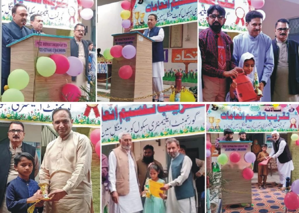 پنڈدادنخان (گوہر وقاص پراچہ)تفصیلات کے مطابق گورنمنٹ ایلیمنٹری سکول کوٹ منگل سین کھیوڑہ میں سالانہ تقسیم انعامات کی پروقار تقریب زیر نگرانی پرنسپل ادارہ ہذا ملک محمد آصف منعقد ہوئی جس کے مہمان خصوصی ڈپٹی ڈی۔ ای ا۔و ملک عدیل عباس۔ معروف ساجی و سماجی شخصیت ڈاکٹر محمد اختر نجمی۔ معروف بزنس مین چوہدری ثاقب رسول۔ سیاسی و سماجی شخصیت ملک شہزاد۔ سیاسی و سماجی شخصیت سنئیر صحافی ڈاکٹر سرفراز عباس اور ملک اعجاز سروئیر نے بچوں میں انعامات تقسیم کیے اور مستحق بچوں کے لیے مختلف قسم کی امداد کا اعلان بھی کیا اور خیالات کا اظہار کرتے ہوئے کہا کہ گورنمنٹ ایلیمنٹری سکول کوٹ مینگل سین کھیوڑہ کا ماحول اور نظم و ضبط ہزاروں روپے فیس لینے والے پرائیویٹ سکولوں سے کہیں زیادہ بہتر ہے تقریب میں خصوصی شرکت ریٹائرڈ ٹیچرز ملک محمد یوسف۔ مرزا محمد بشیر۔مرزا مختار احمد نے کی اور بچوں میں انعامات تقسیم کرتے ہوئے بچوں کی حوصلہ افزائی کی سکول کے ہونہار بچوں نے مختلف قسم کے ٹیبلوں پیش کر کے حاضرین سے خوب داد وصول کی ادارہ کے پرنسپل ملک محمد آصف نے شرکاء اور والدین سے خطاب کرتے ہوئے کہا کہ الحمدللہ ہم ایک ویژن کے تحت کام کر رہے ہیں اور ہمارا ویژن غریب بچوّں کی تعلیم و تربیت پر خصوصی توجہ دینا ہے انہوں نے سکول کے جملہ سٹاف کی تعریف کرتے ہوئے کہا کہ سکول کے تمام ٹیچرز بچوں کی تعلیم کے ساتھ ساتھ ان کی ضروریات زندگی پر بھی خصوصی نظر رکھتے ہیں اور جب ضرورت پڑے تو بچوں کو والدین جیسا پیار دیتے ہوئے ان کی ضروریات کو پورا کر دیتے ہیں ٹیچرز میں سے اعلیٰ کارکردگی دکھانے والے ٹیچر چوہدری نوید شہزاد کھرل اور محترم ٹیچر ذوالفقار حسین کو خصوصی شیلڈ سے نوازا گیا آخر میں پرنسپل ملک محمد آصف نے آنے والے تمام معزز مہمان اور والدین کا شکریہ ادا کیا اور والدین سے گزارش کی کہ وہ بچوں کی سکول میں حاضری یقینی بنائیں تاکہ اپ کے بچوں کا قیمتی تعلیمی وقت ضائع نہ ہو