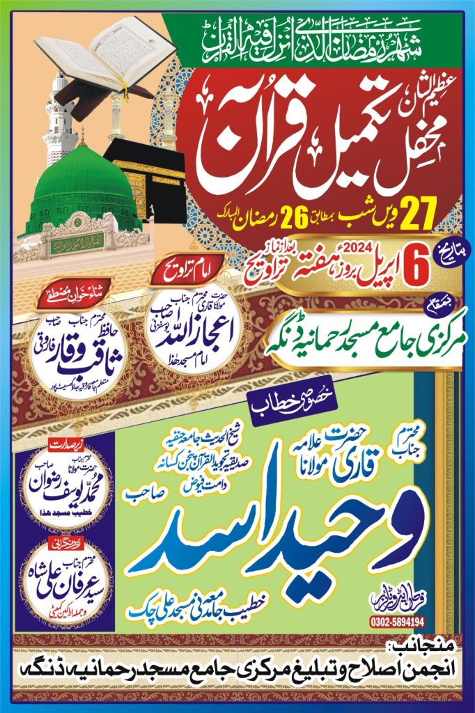 ڈنگہ(احتشام اللہ اسلم)مرکزی جامع مسجد رحمانیہ میں رمضان المبارک کی 27ویں شب(26رمضان المبارک)بمطابق 6اپریل بروز ہفتہ بعد از نماز تراویح عظیم الشان محفل تکمیل قرآن منعقد ہوگی۔صدارت مولانا محمد یوسف رضوان خطیب مسجد ہذا جبکہ نگرانی سید عرفان علی شاہ وجملہ اراکین کمیٹی انجمن اصلاح و تبلیغ کرینگے۔ثناء خوانی حافظ ثاقب وقار فاروقی متعلم جامعہ فاروقیہ بھاؤ گھسیٹ پور جبکہ خصوصی خطاب شیخ الحدیث جامعہ حنفیہ صدیقیہ تجوید القرآن پنجن کسانہ علامہ مولانا وحید اسد خطیب جامع مسجد علی چک کا ہو گا۔اس سلسے میں تیاریوں کو حتمی شکل دے دی گئی۔یاد رہے کہ جامع مسجد رحمانیہ ڈنگہ میں نماز تراویح میں امام مسجد ہذا مولانا قاری اعجاز اللہ یوسفزئی قرآن پاک سنانے کی سعادت ھاصل کررہے ہیں۔