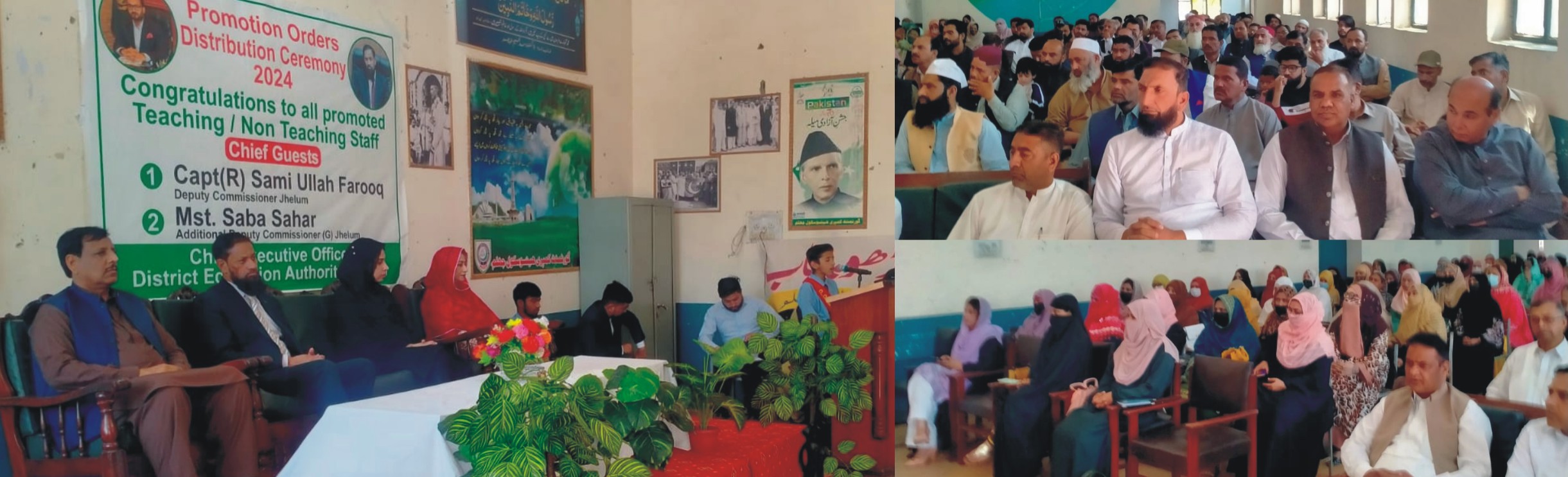 اسٹیج سیکریٹری کے فرائض ڈاکٹر قربان حسین مدرس جامع ہائ سکول جہلم نے سرانجام دیئے۔ تلاوت قرآن پاک اور نعت رسول مقبول صلی اللہ علیہ وآلہ وسلم کے بعد ضلعی تعلیمی افسر محترم رانا جاوید اقبال صاحب نے تقریب کی غرض وغایت بارے آگاہ کرتے ہوئے ترقی پانے والے کلرکس ، اساتذہ کے اعداد و شمار اور محکمانہ ترقی کے مراحل سے مہمان خصوصی اور حاضرین کو آگاہ کیا۔ انہوں نے تمام مراحل میں تعاون کرنے والے دفتری عملہ اور پنجاب ٹیچرز یونین کے قائدین کی کاوشوں کو خراج تحسین پیش کیا۔ انہوں نے ترقی پانے والے تمام کلرکس اور اساتذہ کو مبارکباد پیش کی۔ مہمان خصوصی محترمہ صبا سحر صاحبہ نے اپنے خطاب میں کہا کہ میں نے بطور مہمان خصوصی سینکڑوں تقریبات میں شرکت کی ہے مگر اپنے ماتحت عملہ کے لئے ایسی پروقار تقریب میں پہلی بار شرکت کا اتفاق ہوا ہے۔ انہوں نے سی ای او ایجوکیشن رانا جاوید اقبال صاحب کو خراج تحسین پیش کیا جنہوں نے اساتذہ کی عزت اور وقار کے لئے اس تقریب کا اہتمام کیا۔ انہوں نے ترقی پانے والے اساتذہ کو بھی مبارک باد دی۔