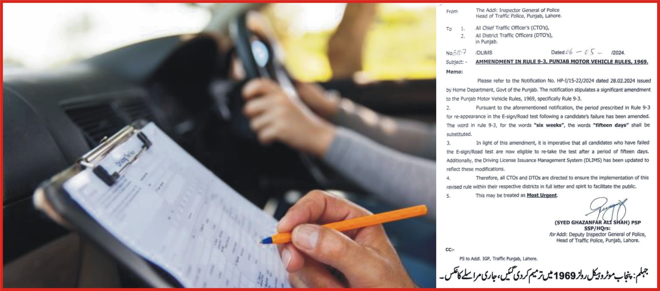 جہلم(چوہدری عابد محمود)جہلم پنجاب حکومت کا بڑا اقدام، ڈرائیونگ ٹیسٹ میں فیل ہونے والے امیدوار اب 15 دنوں کے بعد دوبارہ امتحان میں شامل ہو سکیں گے۔ پنجاب موٹر وہیکل رولز 1969 میں ترمیم کردی گئیں، ڈرائیونگ ٹیسٹ میں فیل ہونے والے امیدواراب 6 ہفتوں کی بجائے 15 دن بعد دوبارہ ٹیسٹ میں شامل ہو سکیں گے۔ اس سے قبل ڈرائیونگ ٹیسٹ میں فیل ہونے والے امیدواروں کو 42 دن کے لئے ٹیسٹ سے باہر کردیا جاتاتھا، آئین میں ترمیم کے بعد فیل ہونے والے امیدوار 2 ہفتے بعد ڈرائیونگ ٹیسٹ میں شامل ہو سکیں گے۔
