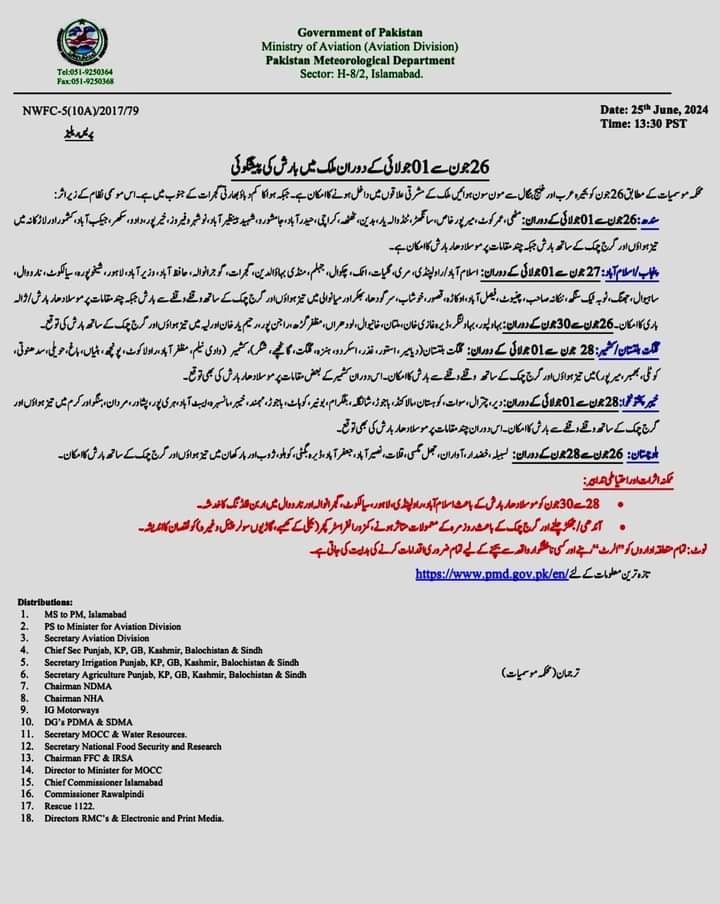جہلم(مرزاقدیر بیگ) محکمہ موسمیات پاکستان نے 26 جون سے یکم جولائی کے دوران ملک کے مختلف علاقوں میں بارشوں کی پیشنگوئی جاری کر دی-صوبائی ڈیزاسٹر مینجمنٹ اتھارٹی (پی ڈی ایم اے) جہلم سمیت صوبہ بھر میں رواں سال مون سون بارشیں 35 فیصد تک زیادہ ہونے کی پیش گوئی بھی کی ہے۔ تفصیلات کے مطابق 27 جون سے 01 جولائی کے دوران جہلم، اسلام آباد، راولپنڈی، مری، گلیات، اٹک، چکوال، منڈی بہاؤالدین، گجرات، گوجرانوالہ، حافظ آباد، وزیر آباد، لاہور، شیخوپورہ، سیالکوٹ، نارووال،ساہیوال، جھنگ، ٹوبہ ٹیک سنگھ،ننکانہ صاحب، چنیوٹ، فیصل آباد، اوکاڑہ، قصور، خوشاب، سرگودھا، بھکر اور میانوالی میں تیز ہواؤں اور گرج چمک کے ساتھ وقفے وقفے سے بارش جبکہ چند مقامات پر موسلادھار بارش کا امکان ہے۔ پی ڈی ایم اے نے ہدایت کی ضلعی انتظامیہ مون سون بارشوں سے قبل تمام تر حفاظتی اقدامات کو یقینی بنائے۔