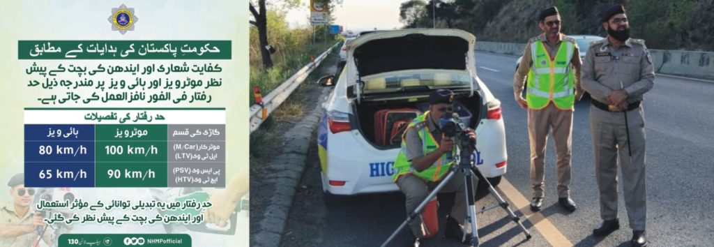 کفایت شعاری اور ایندھن کی بچت کو مدنظر رکھتے ہوئے حکومتِ پاکستان کی ہدایات کے مطابق موٹر ویز اور ہائی ویز پر رفتار کی نئی حدود نافذ کر دی گئی ہیں۔ اس سلسلے میں آئی جی نیشنل ہائی ویز اینڈ موٹروے پولیس سلطان احمد چوہدری کی ہدایات اور ایڈیشنل آئی جی نارتھ ریجنل وصال فخر سلطان کے احکامات کی روشنی میں سیکٹر کمانڈر نارتھ ٹو جہلم ایس پی زاہد نذیر وریاہ کی زیر نگرانی خصوصی آگاہی اور انفورسمنٹ مہم جاری ہے۔